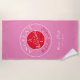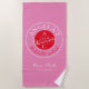 Toalha de praia contemporânea, moderna e vibrante em rosa magenta e vermelho para fim de semana de despedida de solteira com monograma - iniciais, nome, local, data, desenho exclusivo de casal de pássaros românticos e caligrafia manuscrita trendy.