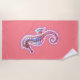 Um cavalo marinho estilizado com matizes rosas e roxas vibrantes se destaca contra um fundo escuro. Ele apresenta um intrincado design com escalas padronizadas e uma cauda enrolada que sugere uma interpretação caprichosa e artística.
