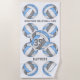 Esta toalha de praia temática de vôlei apresenta um padrão de volebolas brancas, azuis-claras, cinzas e talheres estilizadas brancas, organizadas em um padrão espelhado com texto personalizável entre os volleybolas, o nome atual da equipe e o nome do mascote - o nome do atleta e o número de camisa podem ser personalizados, assim como a cor branca do fundo e a cor do texto - por katz_d_zynes