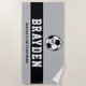Design de toalha de praia personalizada para crianças e adolescentes apresenta uma bola de futebol personalizada com o número uniforme do jogador, texto personalizado para o primeiro ou sobrenome do jogador e texto moderno para o nome do time do futebol. Faz um presente de favor único para torneios e festas de piscina com a equipe! Na moda e design moderno apresentam cartazes de camiseta desportiva varsity e faixas simples horizontais. O esquema de cores das cinzas de luz, preto e branco pode ser modificado para se coordenar com as cores de sua equipe.