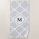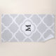 Toalha de praia de cinza com um padrão quatrefoil marroquino branco e um monograma personalizado no centro.