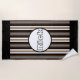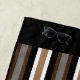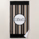 Esta toalha de praia comemorativa apresenta uma design gráfica e geométrica divertida, com cinzas, listras castanhas e pretas. O topo e o fundo são saltados com uma grossa borda preta. O círculo branco com a trim preta tem espaço para o seu nome.