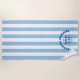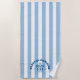 A toalha de praia The Coastal Cowgirl The Beach Denim Blue Cabana Stripe é perfeita para a despedida de solteira na praia ou viagem de amigas... listras azuis claras da cabana com letras "The Beach Club" em azul jeans. Personalize com os detalhes da sua viagem... ano e destino da praia. Acessórios correspondentes na Coleção The Coastal Cowgirl Beach Club.