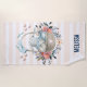 Uma toalha de praia personalizada. Pêssego e padrão listrado branco. Uma ilustração digital feita com aquarelas. Um coelho encantador vestindo um vestido azul sentado em uma cesta cercada por seus ovos. Borboletas à volta da cesta que é decorada com um buquê de flores de rico.