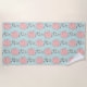 Uma toalha de praia com um coelhinho branco e branco, segurando um grande balão rosa flutuando no ar. Luz azul-esverdeada.
