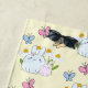 Uma toalha de praia com uma linda mãe e um coelhinho de bebê juntos. Águas amarelas no fundo. Borboletas brancas se espalhando.