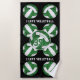 Esta equipe de vôlei colore a toalha de praia personalizada apresenta um padrão de volichões verdes e brancos estilizados dispostos em um padrão espelhado com texto que diz: "Eu amo vôlei" - seu nome e número de camisa são personalizáveis - por katz_d_zynes