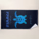 Torre de Praia de Tartaruga do Mar Personalizada, um acessório obrigatório para suas aventuras de verão. Design apresenta tartaruga marinha em tons de aquarela azul vibrantes contra um fundo azul marinho rico. Texto lúdico e elevador "Summer Vibes" escrito na tipografia moderna. Personalize-o com seu nome para torná-lo exclusivamente seu ou para dar como um presente ponderado.