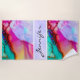 Uma toalha de praia personalizada com um desenho abstrato artístico rico. Pintura aquosa com as cores misturando e misturando criando um padrão ondulado fluente. O centro tem uma textura de aquarela púrpura clara com seu nome personalizado dentro.