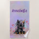 Esta toalha de praia mágica e encantadora apresenta um lindo unicórnio preto. O doce pequeno unicórnio está sentado numa nuvem de ouro-rosa e vários corações cor-de-rosa estão flutuando ao seu lado. O fundo apresenta um padrão opal arco-íris. Um nome de exemplo é impresso na parte superior que você pode personalizar para incluir seu próprio nome personalizado ou texto.