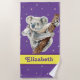 Uma adorável toalha de praia de urso koala apresentando uma mãe e um urso bebê numa árvore. Uma toalha roxa de praia para as crianças que amam animais
