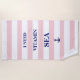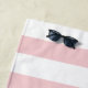 Esta bela toalha de praia é uma inscrição azul marinho com uma ilustração de âncora num fundo listrado rosa e branco.