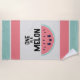 Uma toalha de praia caiana, linda, com uma fatia adorável de melancia com olhos sujos e um sorriso doce. Acima da fatia de melão estão as palavras Um em um melão em letra negra.