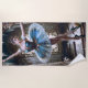 Dançarina balé vestindo um tutu azul e dourado no meio da dança.