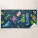 Esta toalha de praia personalizada é a combinação perfeita de diversão e funcionalidade, projetada especificamente para entusiastas de dinossauros que amam um toque de capricho em suas aventuras diárias. Apresentando dinossauros agudos e bonitos em um fundo azul marinho, com a opção de adicionar um toque pessoal com o nome do seu filho exibido em uma fonte divertida, fazer este item perfeito para creche, jardim de infância e escola. Excelente para acampamentos de verão, piscinas e de volta à escola.