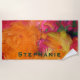 Esta toalha de praia original, personalizada é decorada com nossa fotografia original do rosa alaranjado, quente brilhante, e das penas do amarelo. Colorido, festivo, e DIVERTIMENTO". Você pode facilmente personalizar ou suprimir do nome. Todos os direitos reservados © Alan 2017 & Marcia Socolik