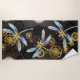 Marcadores e teclas antigas com engrenagens de ouro e latão, decoradas com libélulas mecânicas e boias em fundo castanho e listrado.