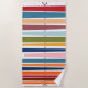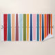 Esta toalha de praia tem uma design moderna do século médio de linhas coloridas horizontais em uma linha preta vertical com círculos.
