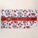 Esta toalha de praia temática de futebol para raparigas ou rapazes apresenta um padrão aleatório, em 3D, de esferas de futebol de dimensão variada que se virou em todos os sentidos num fundo branco personalizável - os painéis tipicamente negros em cada bola de futebol foram recoloridos em vermelho e cinza - personalizam-se com o nome do atleta e o número de camisa - por katz_d_zynes