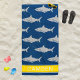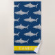 Design de toalha de praia personalizada e feroamente legal apresenta um fundo azul marinho náutico com um padrão oceânico de tubarões brancos excelentes coloridos. Adicione um primeiro ou sobrenome ao espaço de texto personalizado de todos os bonés modernos com um simples quadro listrado amarelo brilhante.