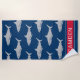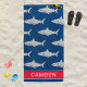 Design de toalha de praia personalizada e feroamente legal apresenta um fundo azul marinho náutico com um padrão oceânico de tubarões brancos excelentes coloridos. Adicione um primeiro ou sobrenome ao espaço de texto personalizado de todos os bonés modernos com um simples quadro listrado vermelho.