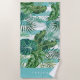Adicione talento tropical à sua praia ou piscina dias com esta legal toalha de praia botânica impressa em tons de praia de verde, turquesa e branco. Design apresenta um padrão de folhas verdes de bananas, monstera e frondes de palma sobre o aqua e listras brancas. Personalize com um nome individual, nome da família ou monograma na parte inferior em caracteres brancos clássicos.