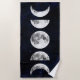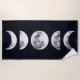 Uma bela toalha de praia apresentando fases da lua sobre um fundo de galáxia.