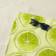 Um padrão de fatias frescas e suculentas de limão em tons brilhantes e vívidos de verde limão, com uma textura aquosa que lhe dá aquele aspecto recém cortado. Eles são colocados sobre um fundo amarelo claro / verde para um visual brilhante e de verão.