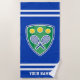 Toalha de praia feita sob encomenda do tênis com logotipo cruzado da raquete. Beachtowel azul personalizado com listras atléticas e tipografia. Adicione suas próprias letras engraçadas das citações, do nome ou do monograma. Refrigere a ideia do presente de aniversário para crianças adolescentes, o pai legendário, o melhor marido, o vovô super, o filho, o pai, o pai novo, tio do mundo o grande, o stepdad, o irmão, o amigo aposentado, o noivo, o chefe, o trabalhador do co, o colega, o treinador de esportes, o instrutor pessoal, o instrutor da malhação, o pensionista, o jogador, o atleta, o fã, o adolescente, os miúdos, o menino, os acessórios do verão do divertimento da menina etc. para a praia ou a piscina. Design desportivo com cor customizável do fundo. Logotipo cruzado das raquetes e 3 bolas de tênis amarelas no emblema do protetor.