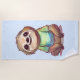Toalha de praia com uma ilustração adorável com uma preguiça feliz vestindo uma camiseta verde. Sentado de pernas cruzadas, com aparência relaxada.
