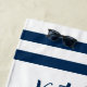 Toalha de praia personalizada para fim de semana de despedida de solteira com tema náutico apresenta um design de âncora de barco e listras em estilo costeiro com texto personalizado que pode ser customizado com o nome da noiva e o destino e data da viagem. Esquema de cores clássico em azul marinho e branco. Excelente presente para as damas de honra, familiares e amigos presentes.