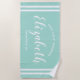 Toalha de praia personalizada para o fim de semana de férias das meninas apresenta um primeiro nome personalizado em escrita moderna emoldurado por listras costeiras, com texto personalizado para a ocasião. A cor de fundo azul aqua pode ser modificada. Por favor, visite nossa loja para outras opções de cores.