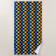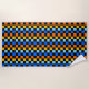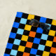 A vibrant checkerboard pattern featuring alternating rows of orange, yellow, light blue, and blue squares against a black background. The design is bold and energetic.