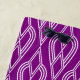 Esta toalha de praia tem um design de diamantes Art Deco ligado por linhas curvas em branco num campo de roxo.