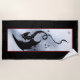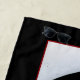 Dragão tribal preto com um pano de fundo de cinza azul com pequenas flores vermelhas e borda vermelha.