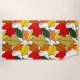 Essa toalha de praia tem um design de folhas se repetindo para fazer uma pilha de folhas em tons de amarelo, vermelho, laranja e verde.