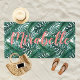 Toalha de praia tropical personalizada com estilo apresenta seu primeiro nome em escrita cursiva rosa coral / salmão feminino e moderno com um padrão de fundo trendy de folhas de palmeira e monstera em verde-jungle rico com uma aparência pintada à aquarela. A cor de fundo branca fresca pode ser modificada via Personalizar / Personalizar Mais. Perfeito para dias quentes de verão na praia e piscina.