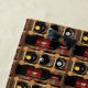 Aqui está uma toalha de praia muito legal, que apresenta um padrão repetido de abstrato de garrafas vermelhas e negras de vinho burgundy próximas a mais garrafas numa prateleira de vinho marrom, dourado e amarelo. Um fundo de tijolos laranja rústico completa a composição.