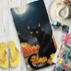 Um gato preto se senta na porta com abóboras, lanterna, vassoura, folhas de outono e lua de colheita de cheio atrás.