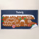 Esta toalha de praia personalizada faz um presente de Natal perfeito para os donos de veículos. Ele apresenta uma ilustração de um RV de pão de gengibre. Esta camisa festiva de biscoito é decorada com gelo branco e doce vermelho e verde e colocada sobre um fundo azul marinho. A toalha está pronta para ser personalizada com um nome ou outro texto personalizado no topo.