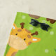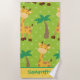 Leve os seus filhos numa aventura com esta girafa fofinha toalha de praia. Usando um pano de fundo de bolinhas verde há uma girafa e um padrão de palmeiras que preenche o design. Na parte inferior está uma caixa verde e marrom-claro que insere um nome. Personalize sua toalha de praia temerária da girafa hoje! Trabalho de arte criado por: Prettygrafik design (https://www.etsy.com/shop/Prettygrafikdesign)