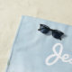 Esta toalha de praia apresenta uma cena ao lado do polo com um guarda-chuva listrado rosa e branco e duas cadeiras de salão. Este desenho pode ser personalizado com um nome clicando em "personalizar este modelo".