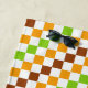 A vibrant checkered pattern of alternating green, orange, and brown squares on a white background. The design creates a lively, geometric feel.