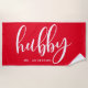 Celebre seu novo status com esta ousada toalha de praia "Hubby" em vermelho e branco, perfeita para luas de mel, dias de praia ou relaxamento ao lado da popa. Criada para noivos e maridos, esta toalha pode ser personalizada com um sobrenome, fazer-a como um presente ou acessório na moda. Esteja você na praia ou na piscina, esta toalha é uma maneira divertida de mostrar seu amor e estilo.