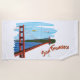 Uma toalha para qualquer um que ama San Francisco: características deste design uma ilustração lunática de golden gate bridge com San Francisco Bay e a cidade no fundo. Um plano amarelo voa acima da ponte que reboca uma bandeira com o texto "Califórnia" e uma imagem do urso da bandeira do estado. O texto "San Francisco" publica-se no direito inferior em uma pia batismal brincalhão, alaranjada esboçada no preto.
