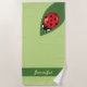 Esta toalha de praia apresenta a ilustração de desenho de Destei de uma joaninha vermelha com pontos pretos numa grande folha verde. Na parte inferior há uma faixa verde com uma área de texto personalizável para um nome. A cor de fundo é verde-claro.