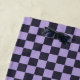 A vibrant checkered pattern with alternating black and lavender squares creates a bold, symmetrical grid. The design is balanced and visually striking.