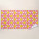Esta toalha de praia tem uma design geométrica de repetição de triângulos cor-de-rosa e laranja com círculos amarelos em cima num campo de esbranquiçado. Quer o mesmo design em cores diferentes? Me mande mensagem.