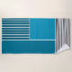 Esta toalha de praia tem um design geométrico de um grande retângulo teal no canto superior esquerdo, listras teais mais escuras no canto superior direito, um retângulo teal menor mais claro abaixo das listras e linhas pretas na parte inferior. Se você gosta do design, mas prefere cores diferentes, me mande mensagem.