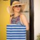 Toalha de praia clássica com listras de cabana em azul profundo ( #004095) e branco. Personalize-o agora com um nome. Pode também adicionar um monograma/logótipo, etc. Design por Alma Wad.